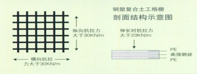鋼塑復合土工格柵以高強鋼絲(或其他纖維),經(jīng)特殊處理,與聚乙烯(PE),并添加其他助劑,通過擠出使之成為復合型高強抗拉條帶,且表面有粗糙壓紋,則為高強度加筋土工帶。由此單帶,經(jīng)縱、橫按一定間距編制或夾合排列,采用特殊強化粘接的熔焊技術焊接其交接點而成型,則為加筋土工格柵。